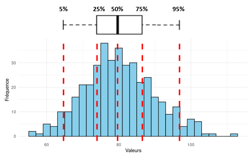 Les quantiles sont des valeurs qui divisent un ensemble de données. Par exemple :