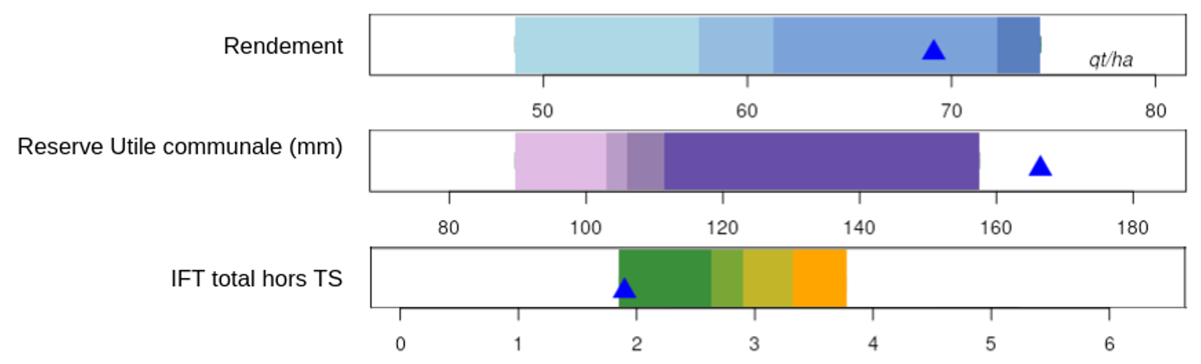 Des échelle neutre reflète simplement la variation de l’indicateur sans valeur qualitative. Avec la nuance de bleu clair à foncé pour les indicateurs de performance de l’exploitation. Et la nuance de violet clair à foncé pour les indicateurs de contextualisation de l’exploitation dans son environnement.