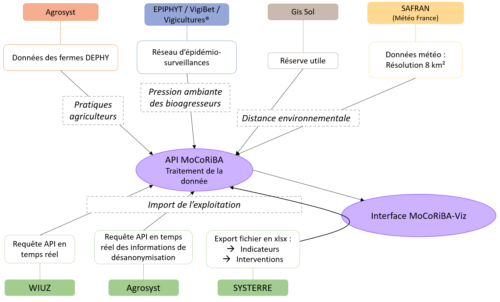 Les données EPIPHYT rassemblait les observations en matière de santé des végétaux réalisées sur l’ensemble du territoire, dans le cadre du réseau d’épidémiosurveillance porté par le plan ECOPHYTO. Le système d’information Vigicultures® s’est ensuite progressivement imposé comme base de centralisation des données au niveau national. Ces données sont utilisées par le projet MoCoRiBA pour calculer des indicateurs de pression sur plusieurs bioagresseurs.