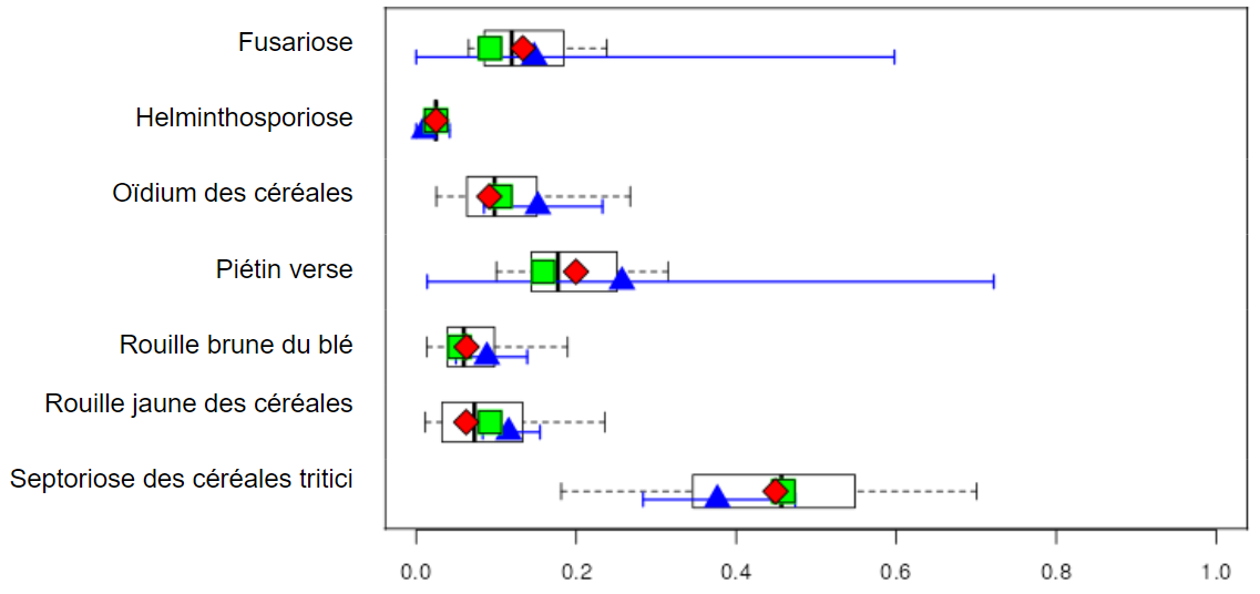 Les graphiques liés aux bioagresseurs des cultures sont issus de résultats de modèles. Ils sont présentés avec des barres illustrant l’incertitude de la prédiction (cf. partie Modélisation des pressions ambiantes des bioagresseurs).