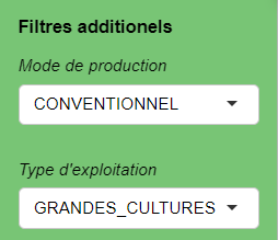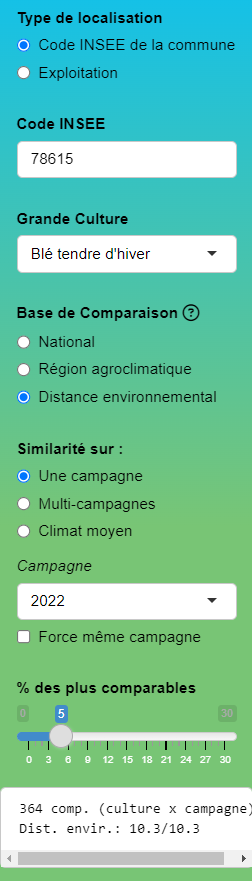 Le panneau de gauche permet de choisir plusieurs paramètres pour définir l’échelle de travail (le système de culture ou une culture spécifique, une campagne ou plusieurs, etc.) et la base de comparaison. Des filtres additionnels sont également disponibles pour affiner la recherche.
